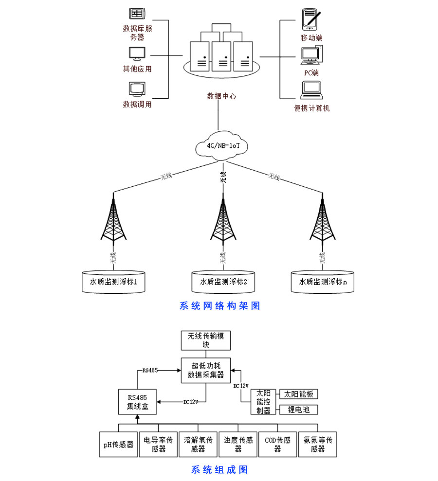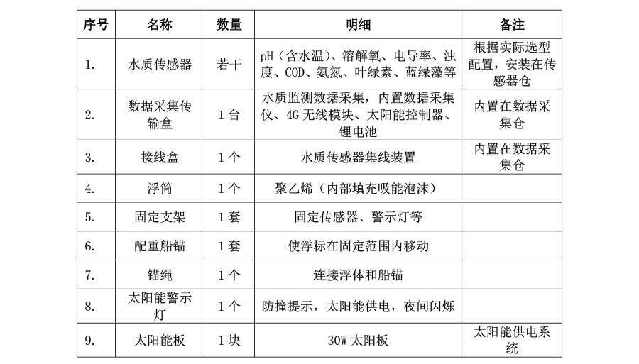 9. 拓展性強(qiáng)且配置靈活,可測(cè)量水質(zhì)、氣象等多種環(huán)境要素,包括水質(zhì)參數(shù)(pH、電導(dǎo)、溶解氧、濁度、葉綠素a、藍(lán)綠藻、水中油、氨氮、COD、等),氣象參數(shù)(風(fēng)速、風(fēng)向、溫度、濕度、氣壓、雨量等),水文參數(shù)(水深、溫度、流速、流向等)。