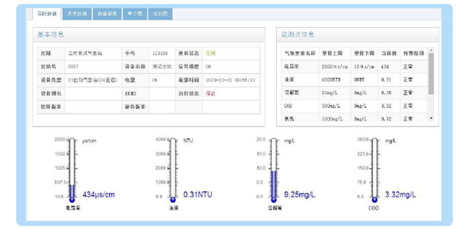 環境監測云平臺可查看通訊卡卡號、儀器與平臺的通訊狀態、信號強度、儀器電量等功能