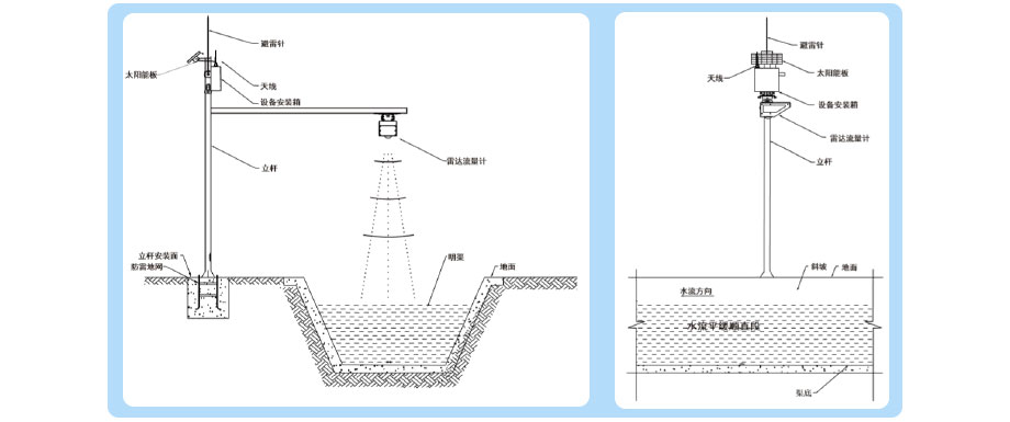安裝時需將雷達流量計垂直固定在支架上,保證流量計安裝高度在測量量程(0.2~7m)內;且需盡量保證發射的雷達波全部照射到水面,以保證測量精度。