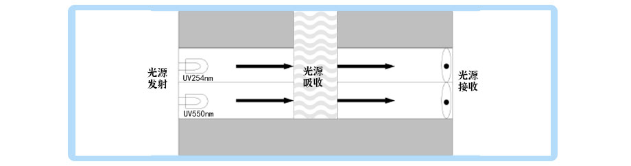 AN-WQSCOD型COD傳感器雙光路測量原理:含有共軛雙鍵或多環(huán)芳烴的有機(jī)物溶解在水中時(shí),對紫外光有吸收作用。因此,通過測量這些有機(jī)物對254nm紫外光的吸收程度,以特別吸光系數(shù)SAC254來表達(dá)測量結(jié)果,作為衡量水中有機(jī)污染物總量的物理量。同時(shí)由于水中濁度對254nm紫外光有吸收作用進(jìn)而影響測量結(jié)果,故采樣對有機(jī)物無吸收但對濁度有的550nm光進(jìn)行補(bǔ)償消除濁度影響。