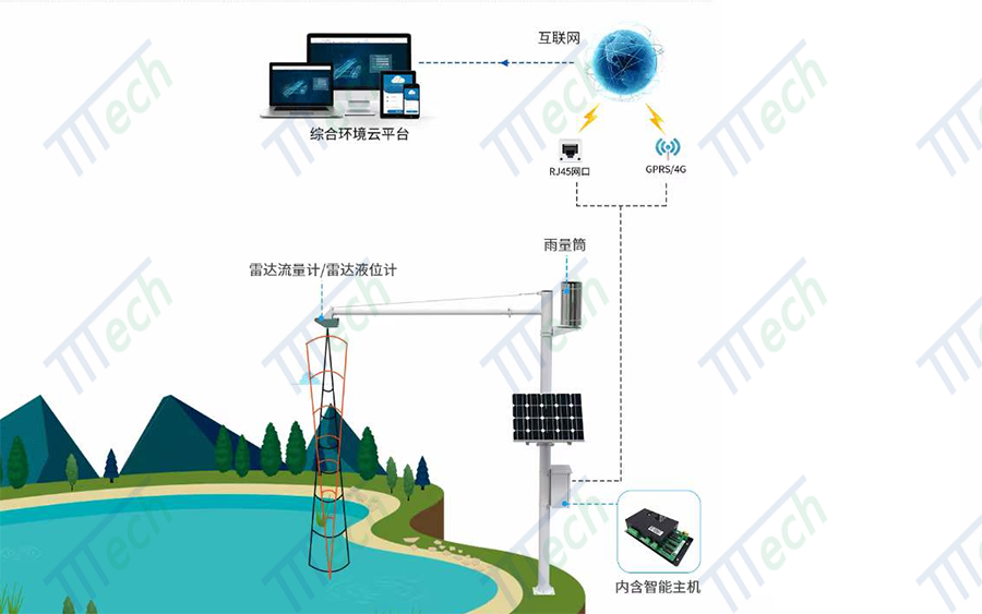 本系統硬件組成鏈條清晰,由高強度碳鋼專用支架、雷達液位計/流量計、翻斗式雨量計、太陽能供電系統、4G網關等組成。
