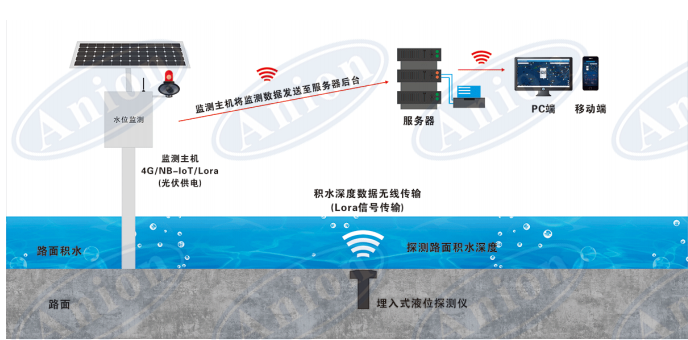 AN-RAWM地埋式路面積水儀由我公司自主研發生產,產品采用聲波多普勒效應測量水深,并結合了無線通訊技術的智能積水儀,它主要完成市政道路、公路易澇點、低洼路段的路面積水檢測,通過無線通訊網絡,將采集的路面積水數據等信息上傳至云端數據平臺。產品既達到工業級設備的性能與功能要求,有效適應在野外、偏遠地區應用的復雜環境。通過市政道路、城市窨井處的路面積水液位檢測及信息化系統建設,構建城市內澇安全預警平臺,提高應急指揮及快速處置能力,保障城市道路系統的安全運行。