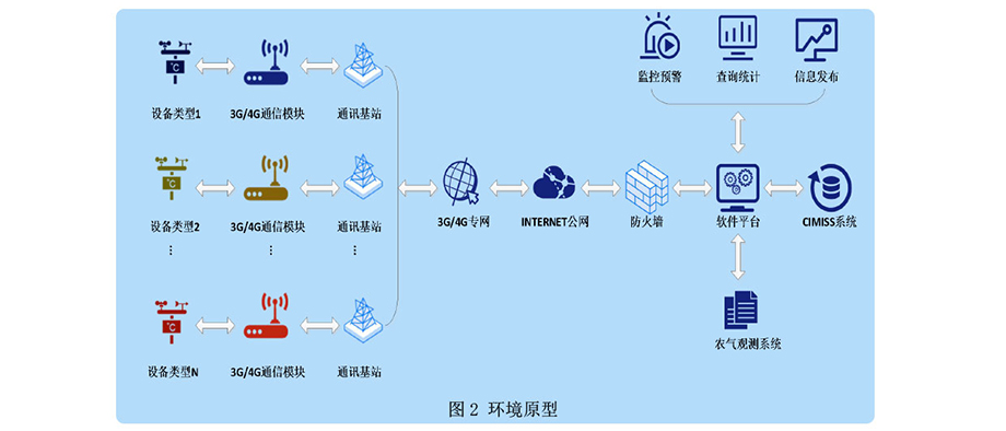 整個系統由數據采集系統、終端系統、云平臺應用軟件系統組成,系統原型如系統傳輸示意圖所示。數據采集系統包括風速、風向、雨量、空氣溫度、空氣濕度、光照強度等檢測儀器,可以將采集數據通過無線通訊方式直接傳輸至中心站,實現對氣象等相關要素的在線監測;終端系統由計算機、網絡設備組成,可以查詢和顯示氣象信息;云平臺應用軟件系統可以實現信息的采集入庫、信息統計分析、系統的管理、預警和對策的發布。
